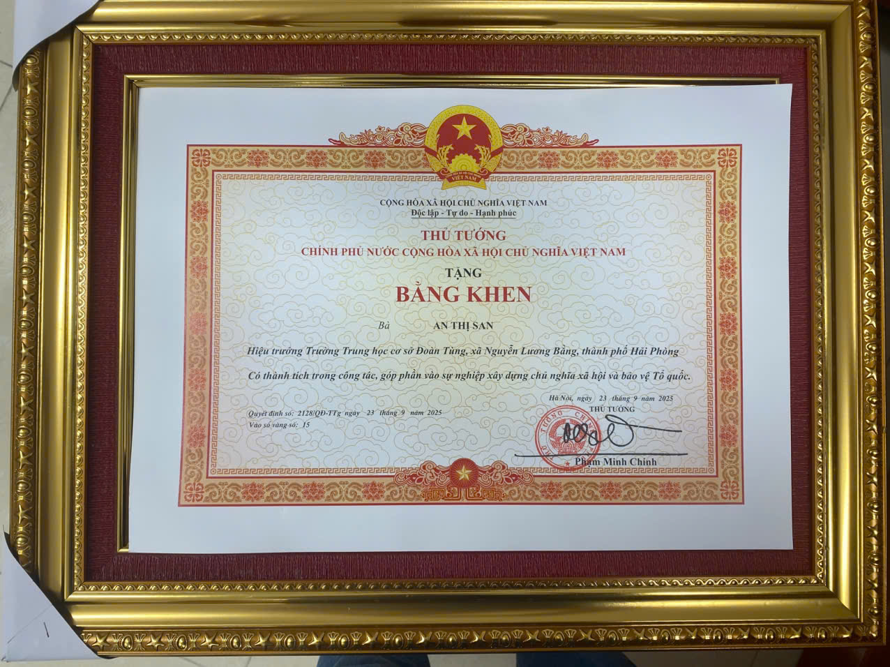 Chúc mừng cô – Với những đóng góp xuất sắc trong nhiều năm, cô An Thị San đã xứng đáng được tặng Bằng khen của Thủ tướng Chính phủ – Một phần thưởng không chỉ ghi nhận thành tích, mà còn ghi nhận cao quý cho sự tận tụy và trách nhiệm cả một hành trình đầy yêu thương và cống hiến của người đứng đầu nhà trường.